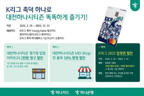 하나카드는 대전하나시티즌의 홈 개막전이 펼쳐지는 2월 23일부터 시즌 종료일인 12월 31일까지 축덕카드 소지자를 위한 특별 혜택을 제공한다. 주요 혜택으로는 ▲대전하나시티즌 MD샵 전품목 10% 현장 할인 ▲대전월드컵경기장 내 이마트24에서 1만5000원 이상 구매 시 건당 2000원 청구할인이 제공된다.