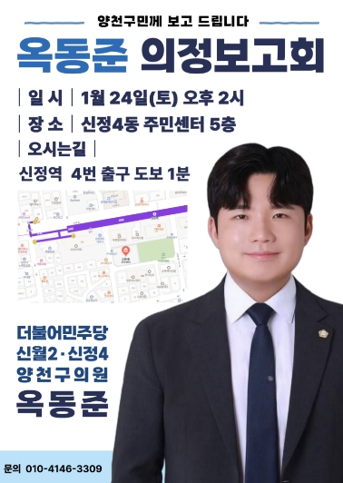 [코리아 이슈저널=홍춘표 기자] 양천구의회 옥동준 의원(더불어민주당, 신정4·신월2동)이 오는 24일 오후 2시 양천구 신정4동 주민센터에서 의정보고회를 열어 그간의 의정활동 성과와 향후 계획을 양천구민께 보고하는 자리를 마련한다.