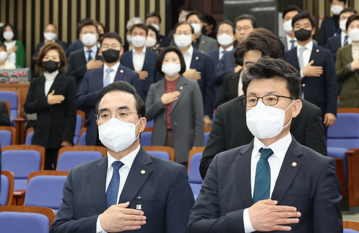 | ▲ 더불어민주당 박홍근 원내대표와 의원들이 15일 오후 서울 여의도 국회에서 열린 정책의원총회에서 국기에 대한 경례를 하고 있다. 2022.11.15 |