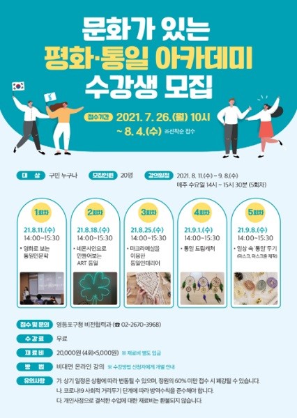 채현일 영등포구청장은 “한반도 평화의 분위기를 확산하고 평화 통일을 위한 올바른 가치관 정립을 위해 이번 강의를 온라인 방식으로 전면 전환해 운영한다”며, “앞으로도 구민들이 함께 참여하고 공감할 수 있는 평화통일 주제의 다양한 프로그램을 적극 지원해나가겠다”고 전했다.