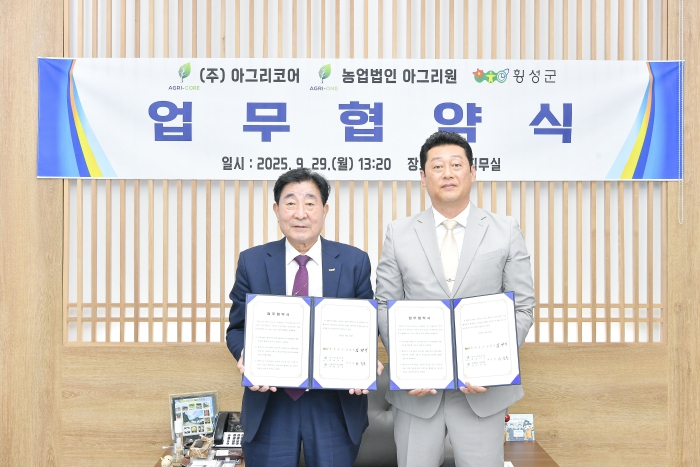 [코리아 이슈저널=최제구 기자] 횡성군은 29일 ㈜아그리코어·농업법인 아그리원(대표 나종훈)과 농산물산지유통센터(APC센터) 및 스마트팜 조성사업 추진을 위한 업무협약(MOU)을 체결했다.