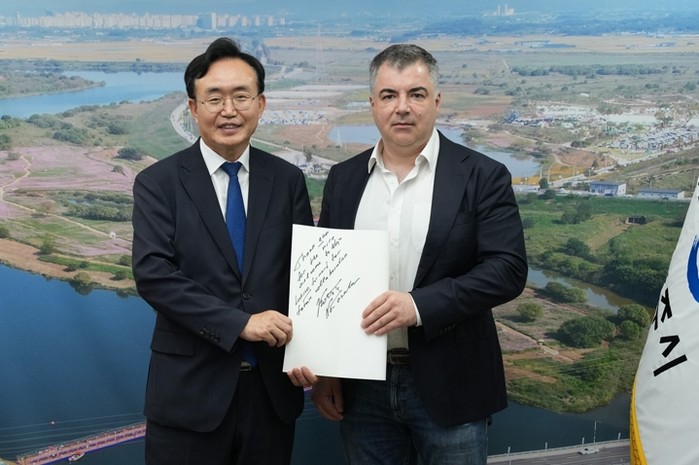 [코리아 이슈저널=김종오 기자] ‘나주글로벌에너지포럼 2025(NGEF 2025)’ 참가를 위해 나주를 방문한 2010년 노벨물리학상 수상자 콘스탄틴 노보셀로프 교수(싱가포르 국립대)가 16일 오후 나주시청을 방문해 윤병태 시장과 환담했다.