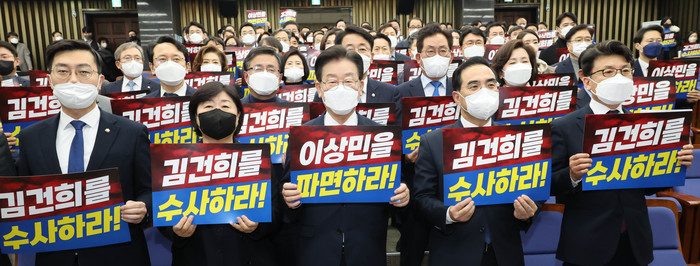 [열린의정뉴스 = 김윤영 기자] 더불어민주당 이재명 대표와 박홍근 원내대표, 서영교 최고위원 등 참석 의원들이 17일 국회에서 열린 의원총회에서 "이상민을 파면하라!", "김건희를 수사하라!"는 구호를 외치며 손피켓을 들고 있다. 2023.1.17