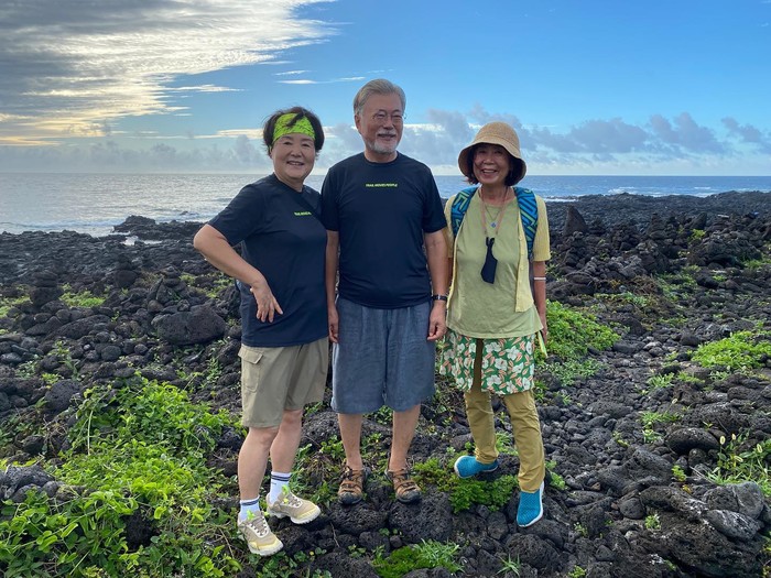 [열린의정뉴스 = 김윤영 기자] 문재인 전 대통령 내외와 서명숙 제주올레 이사장이 3일 제주올레길에서 기념 촬영하고 있다. 2022.8.3 [제주올레 페이스북 캡처. 재판매 및 DB 금지]