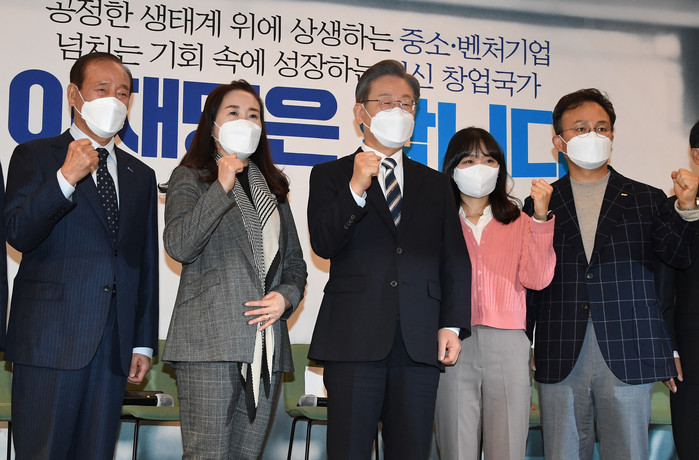 | ▲ 더불어민주당 이재명 대선 후보가 8일 오전 서울 금천구 가산디지털 SKV1 아쿠아픽센터에서 중소.벤처기업 정책공약을 발표를 마친 뒤 참석자들과 기념촬영을 하고 있다. 왼쪽부터 이광옥 (주)반도회장, 황주원 (주)유비스대표, 김혜인 (주)새누 대리, 이계우 아쿠아픽 대표이사. 2021.12.8 [국회사진기자단] |