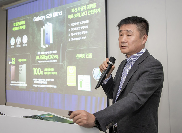 박성선 MX사업부 기구개발팀장(부사장)은 13일 서울 중구 태평로빌딩 삼성전자 기자실에서 브리핑을 열고 친환경 부품 개발 과정과 의미에 관해 설명하면서 "내구성과 신뢰성이 확보된 우수한 품질의 소재 확보와 상품화에 노력하고 있다"고 강조했다.