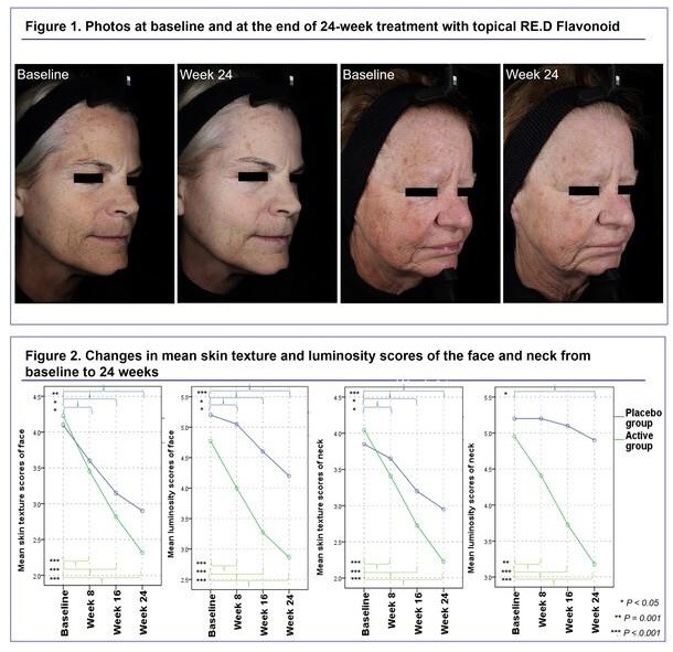 치엔 교수팀의 연구에 따르면, RE.D 플라보노이드는 얼굴과 목 부위의 광노화 증상을 자극 없이 완화시키며, 피부결, 광채, 모공, 색소침착 등 주요 피부 노화 지표에서 뚜렷한 개선 효과를 나타냈다. 특히 피부결과 광채는 사용 8주 차부터 의미 있는 개선이 확인됐다.