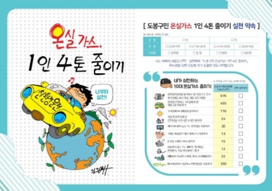 '도봉구민 온실가스 1인 4t 줄이기 실천 약속' 캠페인은 ▶친환경보일러를 설치하고 냉· 난방 온도 준수하기(여름 26℃ 이상, 겨울 20℃ 이하) ▶친환경 운전하고 자가용 대신 1주일에 한 번 대중교통 이용하기 ▶우리 집에 미니태양광 설치하기 ▶먹을 만큼만 밥하기(전기밥솥 보온시간 3시간 줄이기) ▶에너지효율이 높은 TV, 전기밥솥 사용하기 ▶일회용 비닐봉지 대신 장바구니 사용하기 ▶음식물 쓰레기 20% 줄이기 ▶사용하지 않는 TV, 세탁기, 전기밥솥, 전자레인지, 가습기의 플러그 뽑기 ▶재활용이 가능한 유리병, 캔 등 분리 배출하기 ▶에코마일리지 가입하고 친환경상품 사용하기의 '내가 실천하는 10대 온실가스 줄이기' 방안 2가지 이상을 선택해 실천을 약속하는 운동이다.