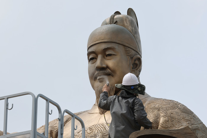 [열린의정뉴스 = 김윤영 기자] 4일 오후 이틀 뒤 개장을 앞둔 서울 종로구 광화문광장에 설치된 세종대왕 동상의 청소 작업이 진행되고 있다. 2022.8.4