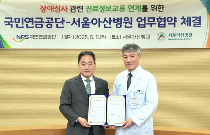 [코리아 이슈저널 = 이창환 기자] 국민연금공단(이사장 김태현)은 8일 서울아산병원(원장 박승일)과 진료정보교류시스템을 통한 전자적 자료 요청 및 수신 협약을 체결했다. 이는 장애정도심사 과정에서 필요한 보완 진료기록을 신속하고 정확하게 확보하기 위한 조치로, 장애인의 편의와 공단의 행정 효율성을 동시에 높일 것으로 기대된다.