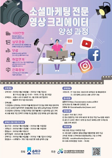 [열린의정뉴스 = 최성일 기자] 송파구(구청장 박성수)는 오는 8월 16일(일)까지 『소셜마케팅 전문 영상크리에이터 양성과정』의 교육생을 공개 모집한다고 22일 밝혔다.