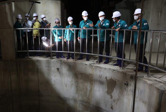 [열린의정뉴스 = 김윤영 기자] 윤석열 대통령이 23일 오후 서울 양천구 목동빗물펌프장 내 대도심 빗물터널을 방문해 유출수직구 하단을 점검하고 있다. 2022.8.23
