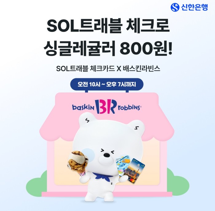 이번 이벤트는 전국 배스킨라빈스 오프라인 매장에서 SOL트래블 체크카드(트래블J 포함) 로 결제 시, 싱글레귤러(컵 또는 콘) 아이스크림을 단 800원에 구매할 수 있는 혜택을 제공한다.