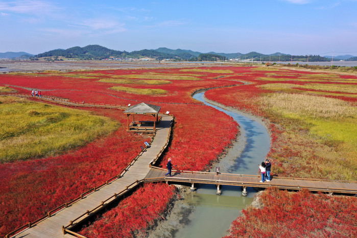 함초와 칠면초는 염분이 있는 갯벌과 습지에서 생육하는 한해살이풀이다. 생장 초기에 녹색이었던 함초는 가을이 되면 붉은색으로 바뀌고 칠면초의 꽃은 8~9월에 펴 차차 자주색으로 변한다. 2021.10.26