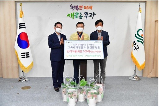 [열린의정뉴스 = 최성일 기자]중랑구(구청장 류경기)일 지난 12일 (사)더불어함께 새희망, 중랑구시설관리공단으로부터 고독사 예방을 위한 반려식물 100개(금 200만 원 상당)를 전달받았다고 밝혔다.