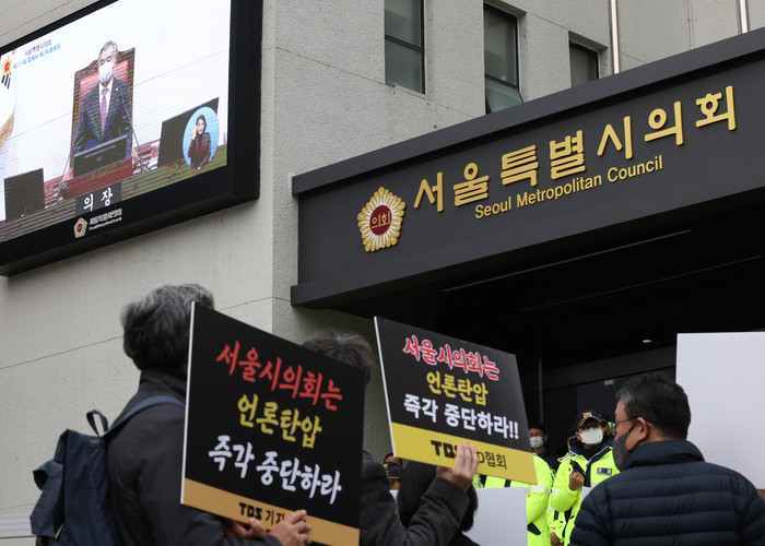 시의회의 '방청 불허' 방침에 따라 입장이 막힌 TBS 구성원들이 생중계되는 본회의를 지켜보고 있다. 2022.11.15