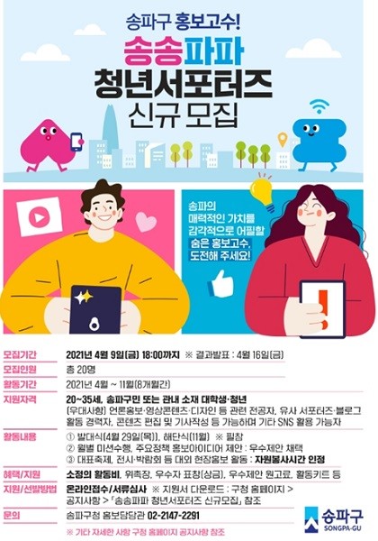 모집 대상은 20세 이상 35세 이하의 송파구민 또는 송파구 소재 대학생, 직장인이며, 20명을 선발할 예정이다. 지원서는 송파구 홈페이지에서 다운받아 작성하여 담당자 이메일(newkh@songpa.go.kr)로 제출하면 된다.
