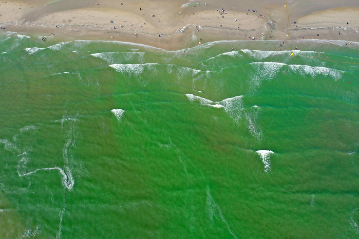 [열린의정뉴스 = 김윤영 기자] 12일 오후 부산 사하구 다대포해수욕장이 초록빛이다. 강에서 떠내려온 녹조로 인해 다대포 해수욕장 입수가 5년 만에 금지됐다. 중부지방에서 집중호우가 발생함에 따라 낙동강 보와 하굿둑을 개방했는데, 이 과정에서 강에 있던 녹조가 바다로 떠내려왔다. 2022.8.12