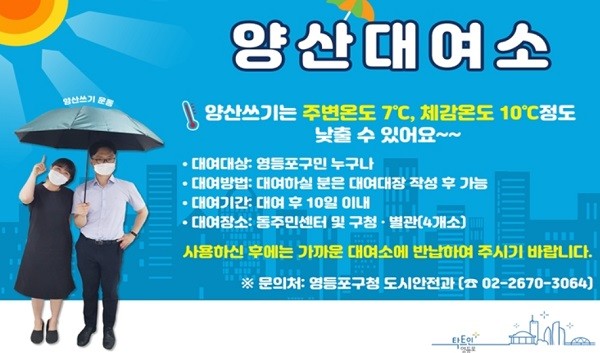 이에, 구민 누구나 원하는 때 손쉽게 양산을 쓸 수 있는 환경을 만들기 위하여 영등포 곳곳 양산 대여소를 개설해 운영한다.