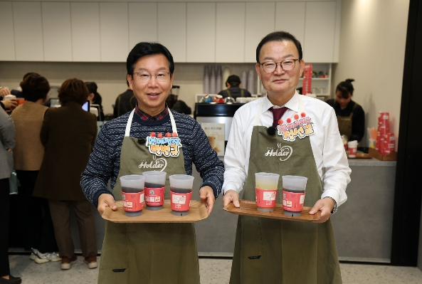 [코리아 이슈저널=김종오 기자] 박병규 광산구청장과 정선교 대명외식산업 대표가 27일 광산구청 1층 모두의 쉼터 조성을 기념해 청각장애인의 자립을 돕는 일터인 구청 내 ‘카페홀더’에서 일일 명예점장 사회공헌활동을 진행했다.