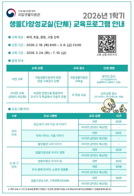 [코리아 이슈저널=최용달 기자] 기후에너지환경부 소속 국립생물자원관(관장 유호)은 2월 19일부터 유아(3~5세), 어린이(6~12세) 및 청소년(13~18세) 단체를 대상으로 2026년 1학기 생물다양성교육 참가자를 모집한다고 밝혔다.