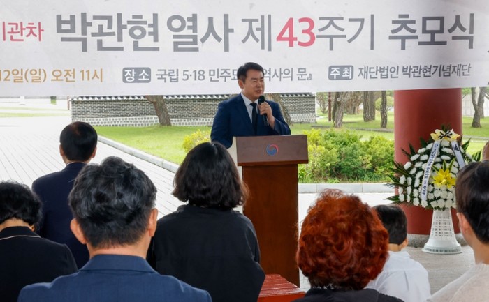 [코리아 이슈저널=김종오 기자] 이정선 광주시교육감이 12일 국립5·18민주묘지 ‘역사의 문’ 앞에서 열린 ‘민주화의 새벽기관차 박관현 열사 제43주기 추모식’에 참석했다.