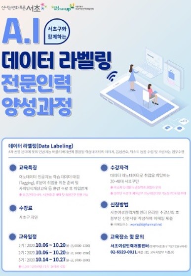 [열린의정뉴스 = 최성일 기자] 서울 서초구(구청장 조은희)가 코로나19로 인해 취업이 어려워진 청년 구직자를 위해, 4차 산업혁명으로 떠오르고 있는 새로운 직업군인 'AI 데이터 라벨링' 전문인력 양성과정을 오는 10월 6일부터 운영한다고 밝혔다.