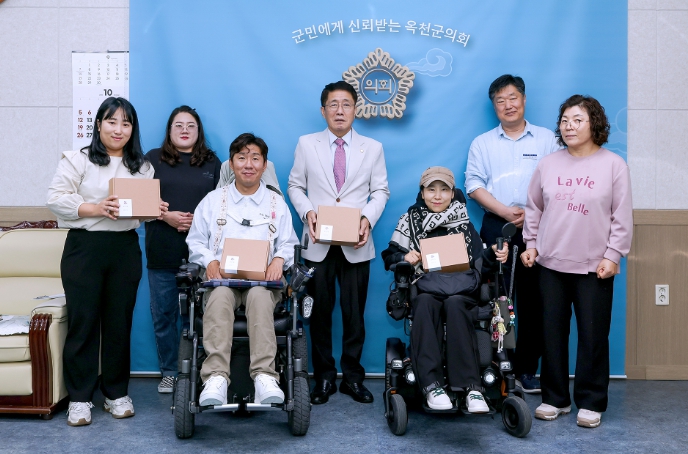 [코리아 이슈저널=홍춘표 기자] 옥천군의회는 지난 14일 의장 집무실에서 충북형 최중증장애인 권리중심일자리 사업 참여자들이 직접 제작한 굿즈를 전달받는 자리를 가졌다.
