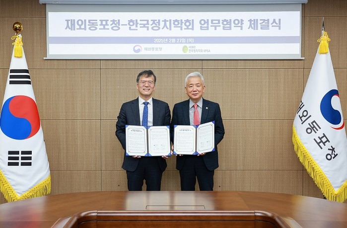 [코리아 이슈저널 = 이창환 기자] 재외동포청(청장 이상덕)은  27일 한국정치학회(회장 김범수 서울대 교수)와 긴밀한 협력체계를 구축하기 위한 업무협약(MOU)을 체결했다고 밝혔다. 이번 협약은 재외동포 정책의 효과적인 수립과 시행을 목표로 하며, 양 기관은 연구·개발 및 학술교류를 강화하기로 했다.