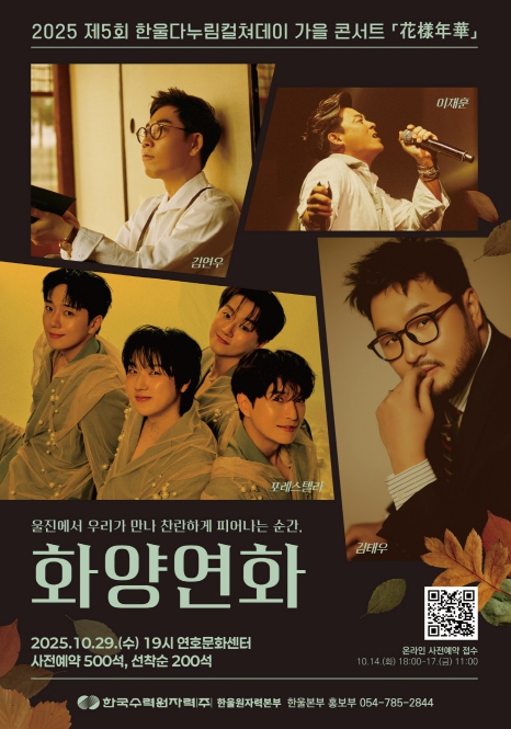 [코리아 이슈저널=김태훈 기자] 한국수력원자력(주) 한울원자력본부는 오는 10월 29일 19시 울진군 연호문화센터에서 ‘화양연화(花樣年華): 찬란하게 빛났던 그 순간’을 주제로, 긴 세월에도 잊히지 않는 청춘의 명곡들을 되새기며 깊어져 가는 늦가을의 정취를 나누고자 제5회 한울다누림컬쳐데이 가을 콘서트를 개최한다.