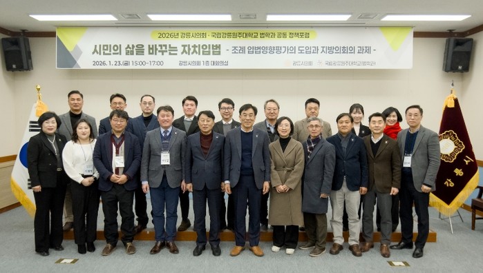 [코리아 이슈저널=홍춘표 기자] 강릉시의회와 국립강릉원주대학교가 시민 중심의 자치입법 실현을 위해 힘을 모았다. 양 기관은 지난 21일 지방 입법정책 발전과 지역공익 법률 지원을 위한 업무협약(MOU)을 체결한 데 이어, 23일 오후 3시 강릉시의회 대회의실에서 '시민의 삶을 바꾸는 자치입법' 정책포럼을 공동 개최했다.