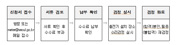 전기차 충전기 ‘수리검정’은 전기차 충전기의 계량 성능에 영향을 줄 수 있는 부분을 수리한 경우 계량값의 정확도를 검정하는 것으로, 산업통상부장관이 지정한 검정기관 및 지방자치단체가 수행할 수 있다. 검정기관은 주로 경기도에 소재하고 있으며, 지방자치단체 중에는 서울시가 최초로 시행한다.