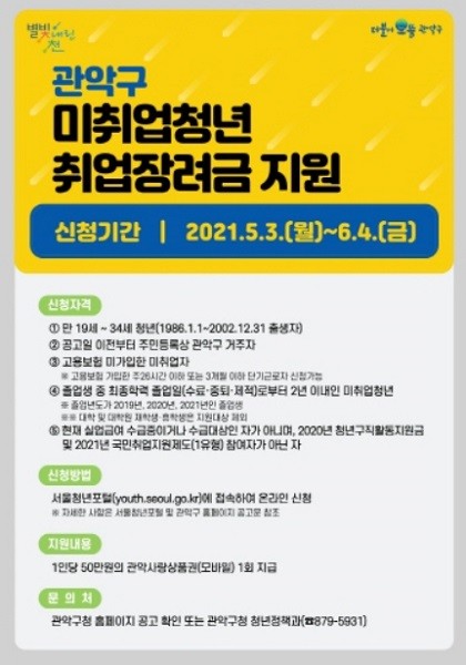 지원대상은 최종학력 졸업 2년 이내인 만 19∼34세의 관악구 거주 미취업청년이며 현재 실업급여 수급 중이거나 수급대상인 자, 2020년 청년 구직활동 지원금 및 2021년 국민취업지원제도(1유형) 참여자는 대상에서 제외된다.