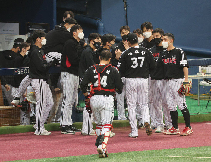 [열린의정뉴스 = 김윤영 기자] 15일 서울 고척스카이돔에서 열린 프로야구 키움 히어로즈와 LG 트윈스의 시범경기에서 9회말에 동점으로 따라 잡히며 경기를 끝낸 LG 선수들이 서로 하이파이브 하고 있다. 2022.3.15