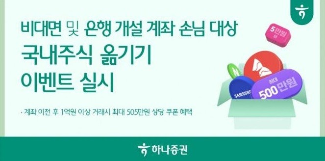 이번 이벤트는 타 증권사에서 보유하고 있는 국내주식을 하나증권 계좌로 옮긴 후 1억 원 이상 거래한 고객에게 최소 5만 원에서 최대 500만 원의 국내주식 매수쿠폰을 제공하는 방식이다. 특히 코스피200 종목을 2,000만 원 이상 이관할 경우, 별도로 5만 원 상당의 매수쿠폰도 추가 지급된다.