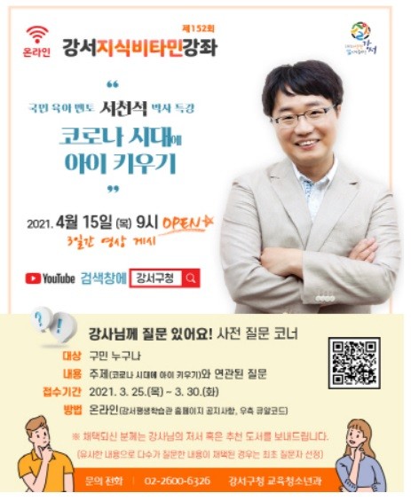 그 시작으로 구는 '코로나 시대에 아이 키우기'를 주제로 제152회 강서 지식비타민 강좌를 개최한다고 밝혔다.
