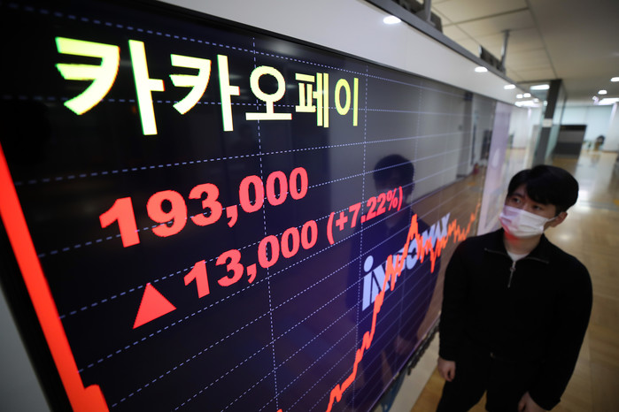 [열린의정뉴스 = 김진성 기자] 3일 서울 종로구 연합인포맥스 모니터에 카카오페이 주가가 표시되어 있다. 카카오페이가 증시에 입성한 이날 공모가보다 2배 이상으로 상승한 가격에 마감했다. 이날 유가증권시장에서 카카오페이는 시초가 18만원보다 7.22% 오른 19만3천원에 거래를 마쳤다. 2021.11.3