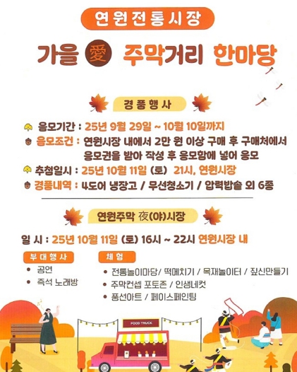 또한 10월 10일까지 연원시장을 이용한 고객을 대상으로 응모권을 배부하고 축제 당일 오후 9시에는 경품 추점 이벤트도 진행될 예정이다.