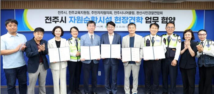 시는 26일 전주교육지원청(교육장 김정기), 전주시주민자치협의회(회장 강민철), 전주시니어클럽(관장 김효춘), 완산시민경찰연합회(회장 성완오)와 ‘지자체와 학교, 지역사회가 함께 협력하는 자원순환시설 견학프로그램’ 운영을 위한 업무협약을 체결했다.