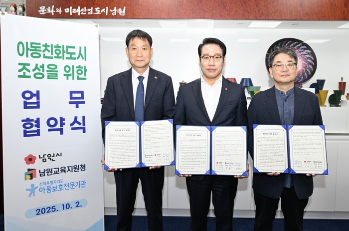 [코리아 이슈저널=김종오 기자] 남원시는 지난 2일 남원교육지원청, 전북동부아동보호전문기관과 함께 아동친화도시 조성 및 아동 권리 증진을 위한 업무협약식을 체결했다.