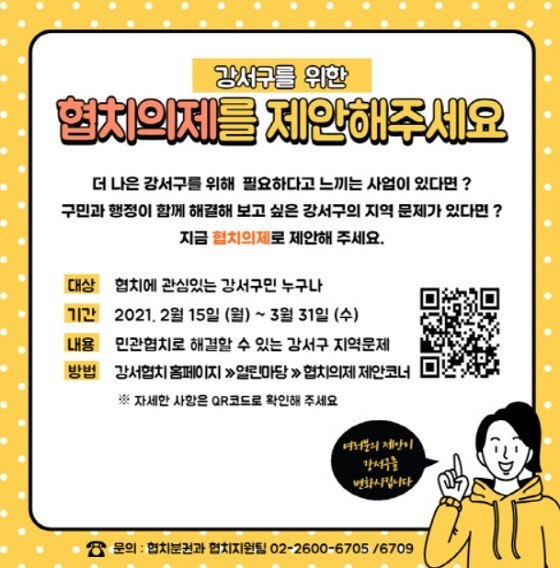 제안은 오는 31일까지 '협치강서 홈페이지-열린마당-협치의제 제안코너'에서 할 수 있다.