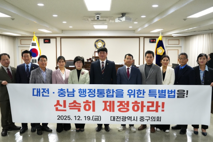 [코리아 이슈저널=홍춘표 기자] 대전광역시 중구의회 김석환 의원은 2025년 12월 19일, '대전충남특별시 설치 및 경제과학수도 조성을 위한 특별법'의 조속한 국회 심의·의결을 촉구하는 결의안을 대표발의하고, “더 이상의 지연은 지방 소멸을 사실상 방조하는 것”이라며 국회의 즉각적인 결단을 강력히 요구했다.