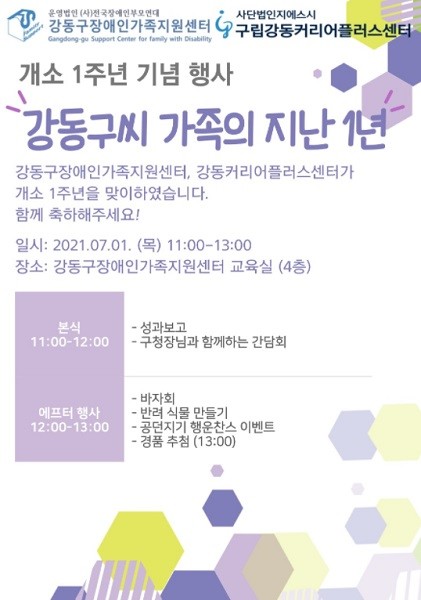 본 행사는 오는 7월 1일(목) 오전 11시~오후 1시까지 강동구장애인가족지원센터(강동구 상일로 12길 95)에서 진행되며, 이정훈 강동구청장은 센터 이용자와 함께하는 간담회를 통해 장애인복지 현장의 소리를 귀담아듣는 시간을 가질 계획이다. 이 외에도 ▶이용자 및 가족들을 위한 바자회 ▶반려 식물 만들기 ▶경품 추첨 등의 다양한 행사를 준비했다.