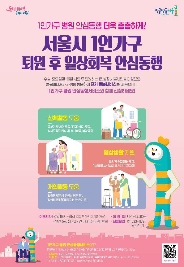 시는 오세훈 시장의 공약사업으로 지난해 11월 시작한 병원 안심동행서비스에 이어 이번에 퇴원 후 일상회복 동행서비스를 추가 시행해 몸이 아파 고통받는 1인가구에 대한 공백 없는 돌봄 지원체계를 구축한다는 목표다.