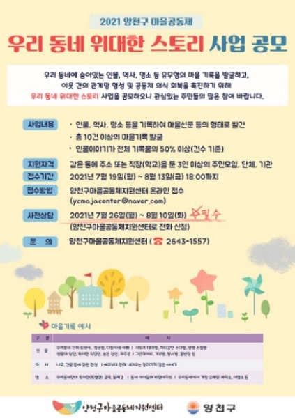 마을 기록 공모사업에 대한 자세한 사항은 양천구마을공동체지원센터로 문의하면 된다.