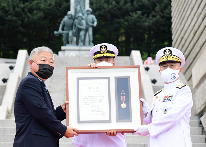 [열린의정뉴스 = 김윤영 기자] 15일 인천상륙작전기념관에서 열린 전승 기념식에서 이종호 해군참모총장(오른쪽)이 6·25전쟁 참전용사인 故 정원수 상사 가족(왼쪽)에게 훈장을 전도 수여하고 있다. 2022.9.15 [해군 제공. 재판매 및 DB 금지]