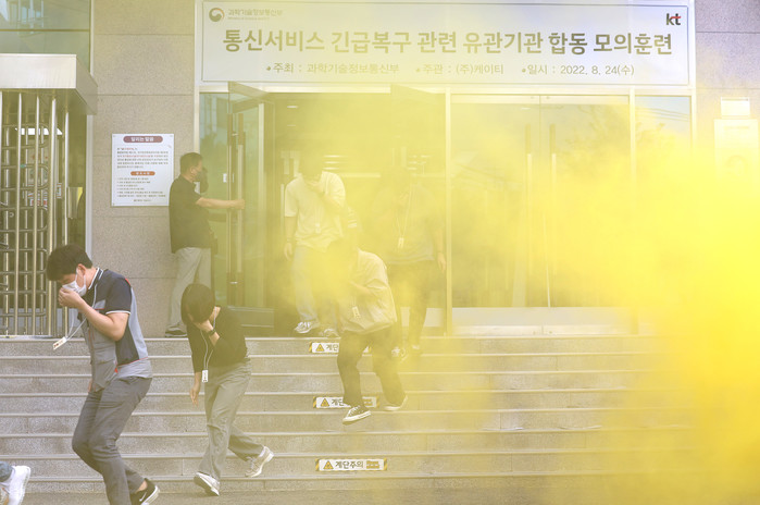 [열린의정뉴스 = 김윤영 기자] 24일 오후 서울 KT구로지사에서 열린 통신서비스 긴급복구 합동모의훈련에서 드론 공격으로 인한 화재 발생을 가정한 대피 훈련이 펼쳐지고 있다. 2022.8.24