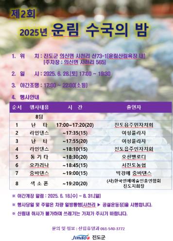 김희수 진도군수는 “관내 예술인과 함께하는 ‘운림 수국의 밤’을 함께 즐겨 주시길 바라며, 약 9천 평의 면적에 수국이 펼쳐진 장관을 모두가 감상할 수 있기를 바란다”라고 말했다.