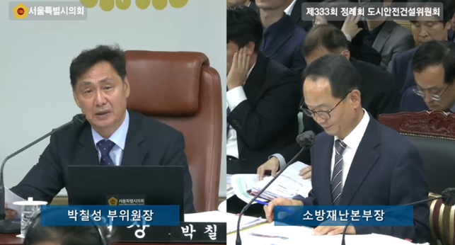[코리아 이슈저널=최성일 기자] 서울특별시의회 도시안전건설위원회에서 부위원장으로 의정활동 하고 있는 박칠성 시의원(더불어민주당, 구로4)은 지난 5일 열린 서울특별시의회 제333회 정례회 도시안전건설위원회 소관 소방재난본부 행정사무감사에서 화재안전 사각지대의 문제점을 지적하고 실효성 있는 대책 마련을 촉구했다.