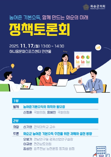 [코리아 이슈저널=홍춘표 기자] 화순군의회는 오는 11월 17일 오후 1시, 하니움문화스포츠센터 만연홀에서 ‘농어촌 기본소득, 함께 만드는 화순의 미래’를 주제로 농어촌 기본소득 정책토론회를 개최한다.